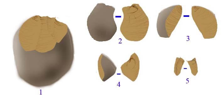 profil , notons le caractère plus ou moins courbé de l'eclat (convexe face superieure, concave coté face inférieure/d'éclatement):