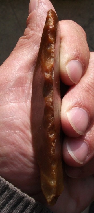 il a été légérement retouché, puis utilisé et certainement ravivé au niveau tranchant :