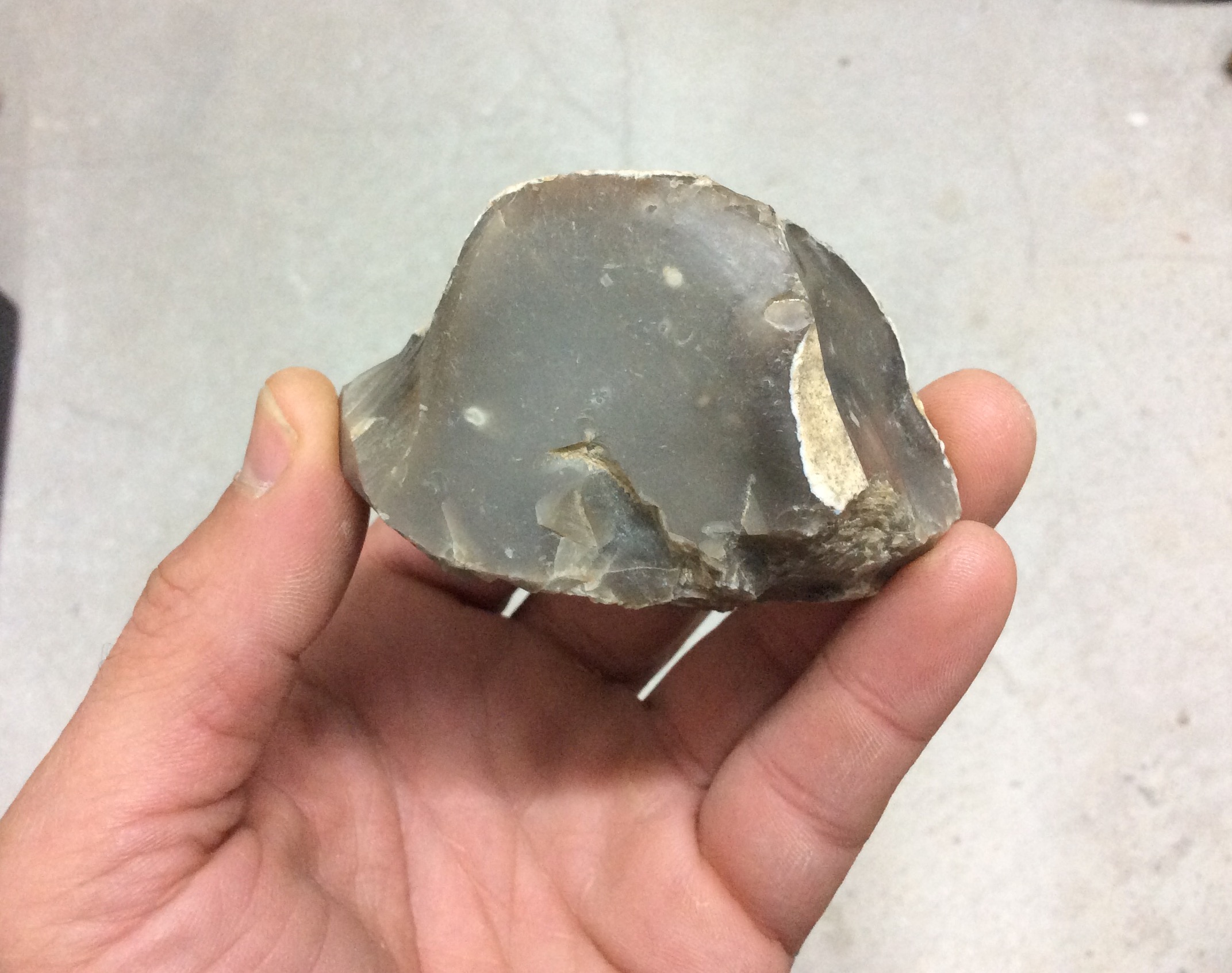 Ces silex proviennent des terrasses alluviales de la Loire très probablement. Ils sont particulièrement roulés, altérés ce qui masque les stigmates de taille sur le 3 il est possible d'observer des cupules thermiques. Le 1 peut être éventuellement à garder si il y a un lien affectif mais sinon le reste est à basarder