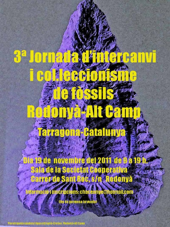 Bonjour tout le monde, je vous rappelle que le 19 novembre serà la 3e. Journée de collectionisme et change de fossiles a Rodonyà, Tarragona, Catalogne.