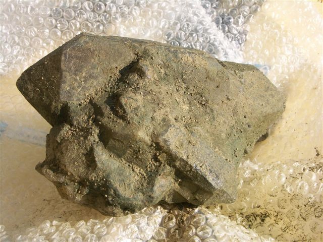 voici ma dernière trouvaille nettoyée, passage au nettoyeur haute pression pour enlever un maximum de chlorite, il a été abimé lors de l'extraction à cause des conditions difficiles et il restera vert à cause de la chlorite. longueur du bi pointe 23cm