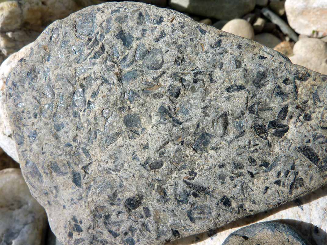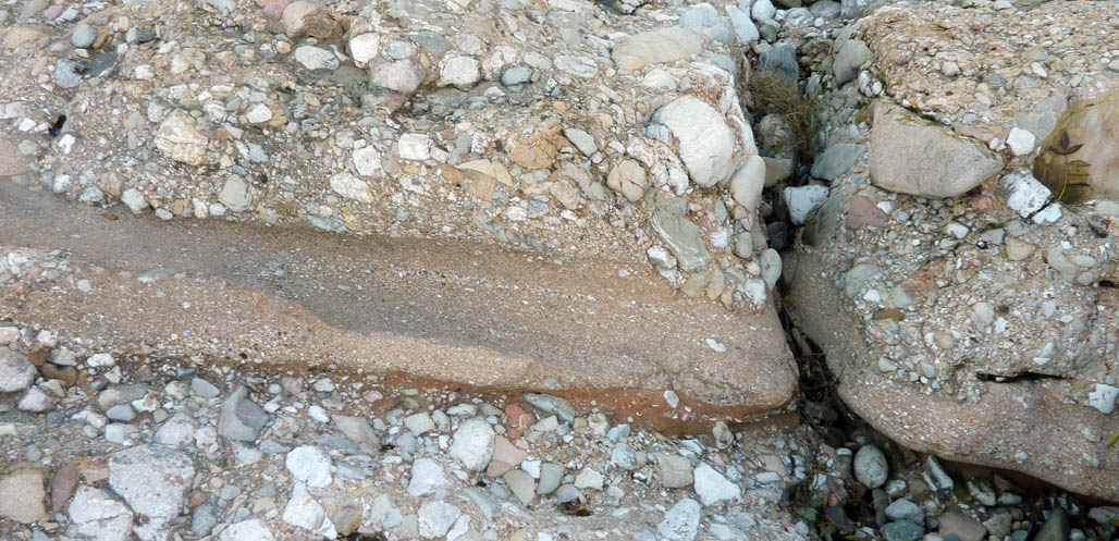 Côte à côte, les conglomérats (galets cimentés = poudingue) du Bartonien, à gauche, et les galets libres des alluvions actuelles de l'Orb, à droite (Réals/Cessenon)