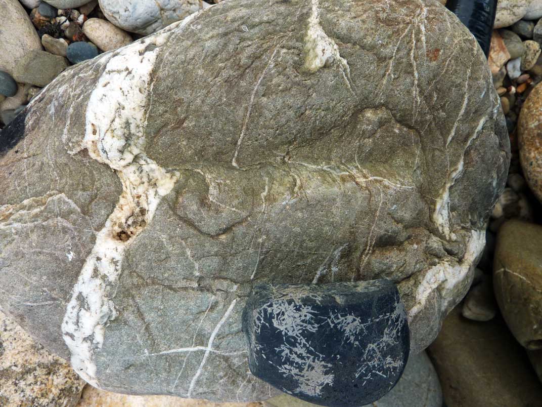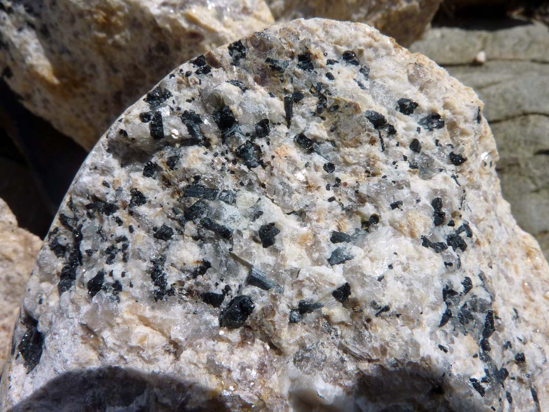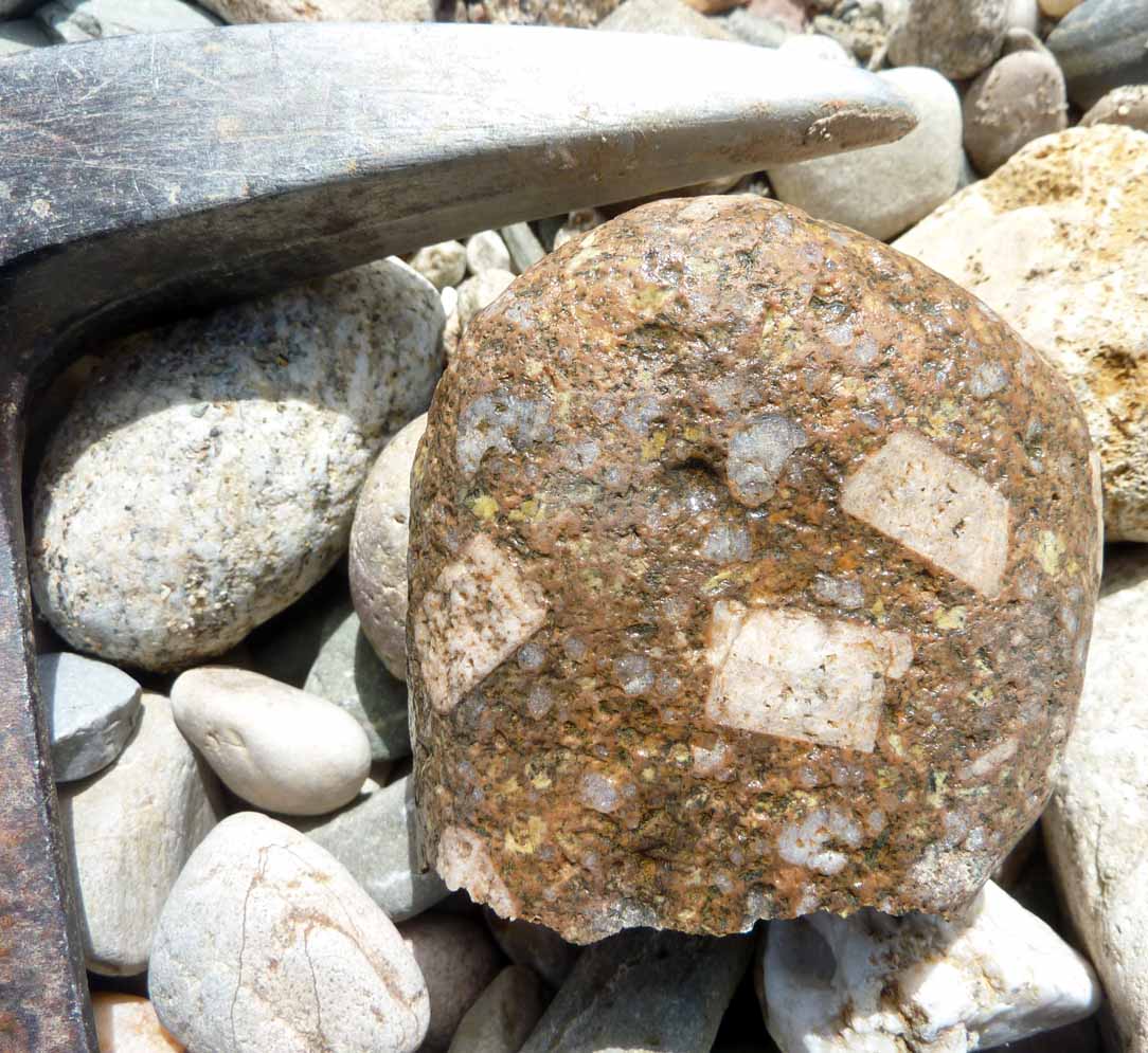 Un coté en gneiss à biotite, le coté opposé en orthose monocristalline, et entre les deux une couche de cristaux de quartz + muscovite.