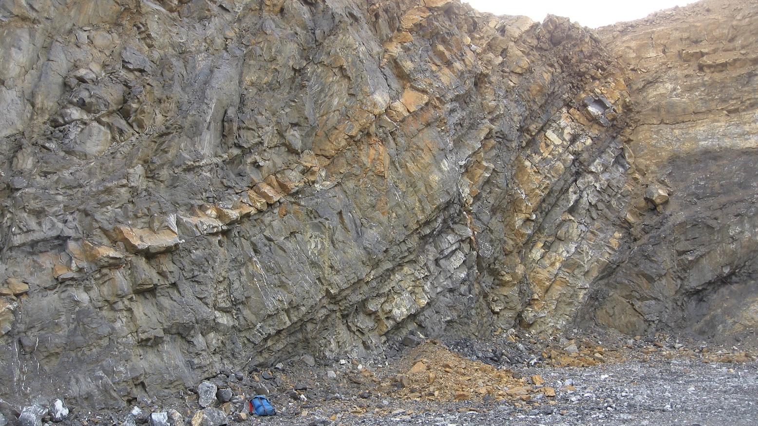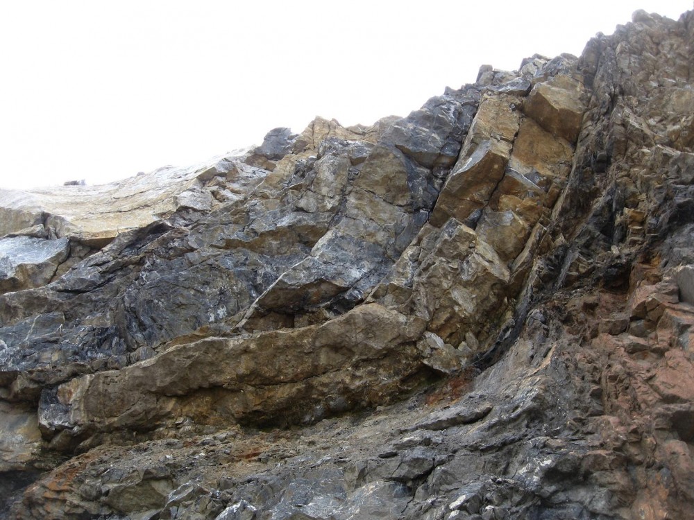 J'y vois encore une strati S0 verticale "à droite" et horizontale "à gauche" de la faille : afin de vérifier la géométrie, vérifier si les coquilles plates (brachiopodes part ex) sont bien orientées selon un plan vertical.