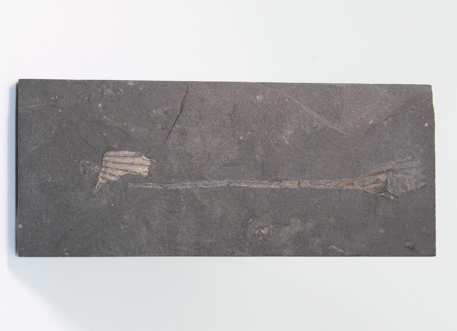 La conservation du proostracum est possible dans les schistes-cartons. J'en ai déjà vu, malheureusement partielles, en éboulis. Mon rêve est d'en trouver des complètes avec le phragmocône et le rostre adjacent également complets, la martingale ! :yahoo: Lors de travaux pour lotissement dans le voisinage , les schistes-cartons ont été entamés. Hélas je n'ai rien pu sauver de consistant, mais j'ai vu des fragments sur plaques  impliquant des fossiles qui devaient facilement dépasser les 40 cm de longueur ! En l'état, je ne saurais dire s'il s'agissait de proostracum, de parties aplaties d'immenses salpingoteuthidae, ou de grands exemplaires de ces très étranges bélemnites non calcitisés, les chitinobelus (cf. Chitinobelus acifer du Toarcien de Holzmaden, ci-dessous)