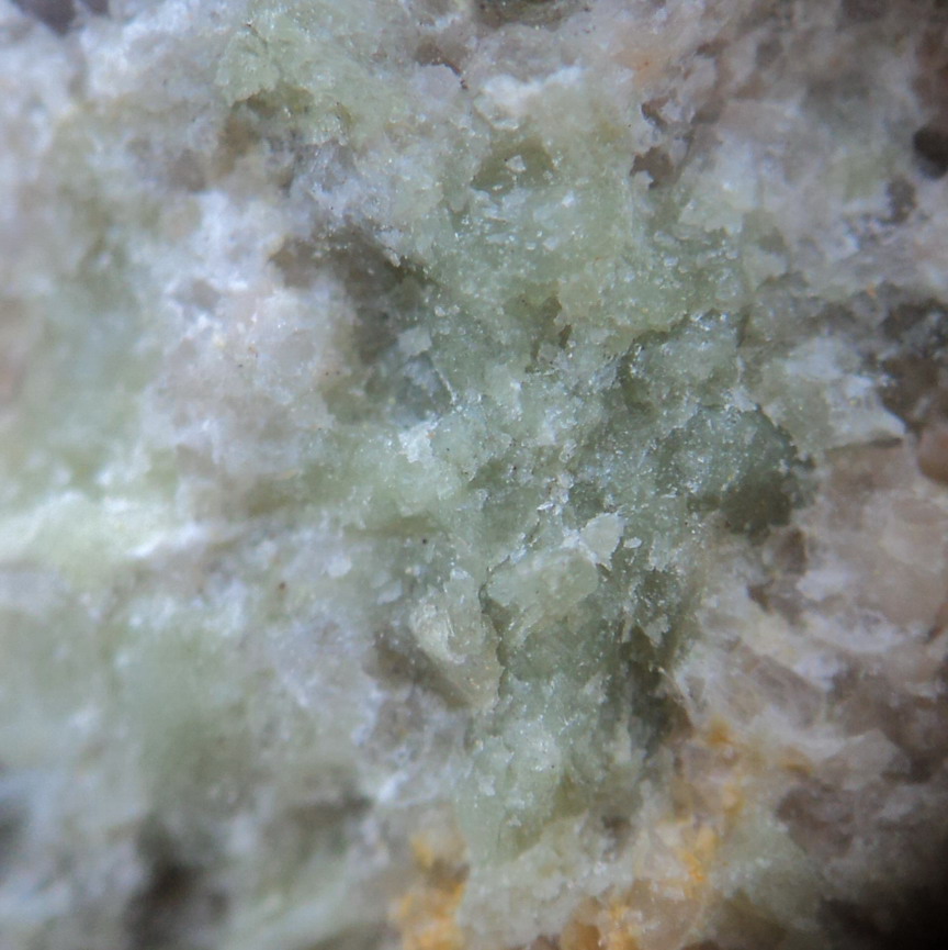 Quant au minéral vert ? Une altération d'un autre minéral (mica, hornblende, ...) dont seule une lame mince et des analyses pourraient déterminer de quoi il s'agit. Les seules choses qu'on connait sont la faible dureté et la trace incolore.