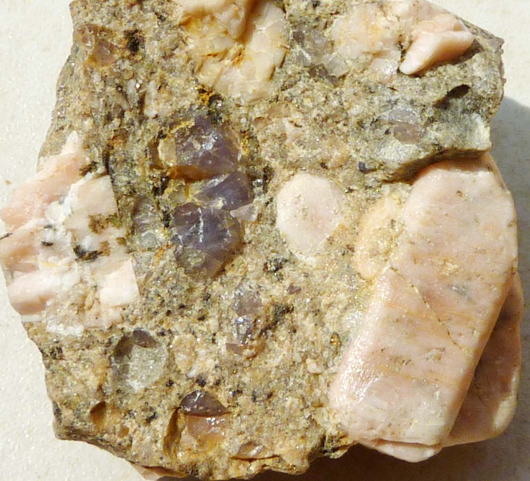 Granitoïde avec orthose et feldspath altéré (couleur verte).