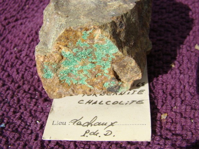 une petite torbernite de lachaux avec son étiquette.