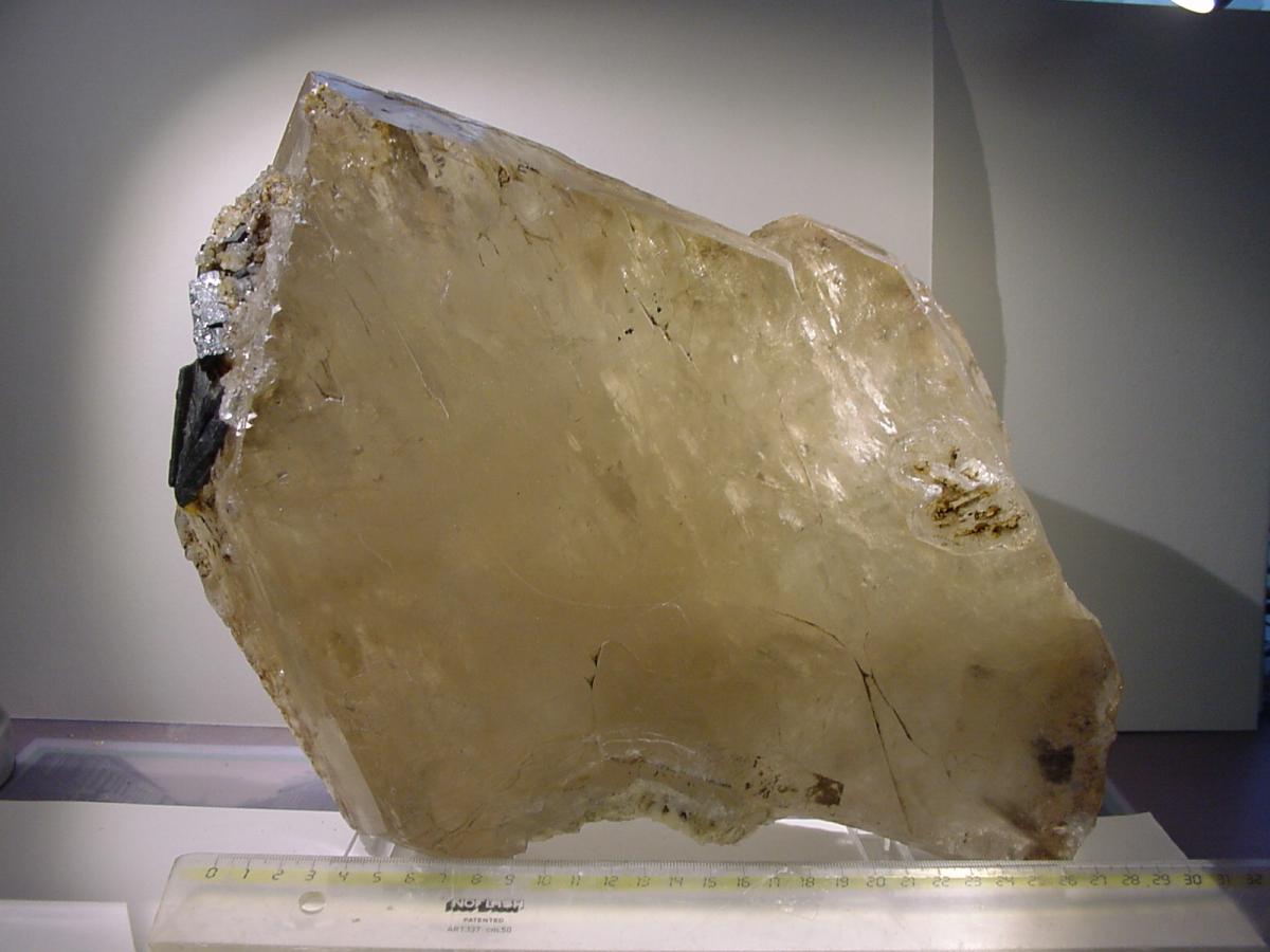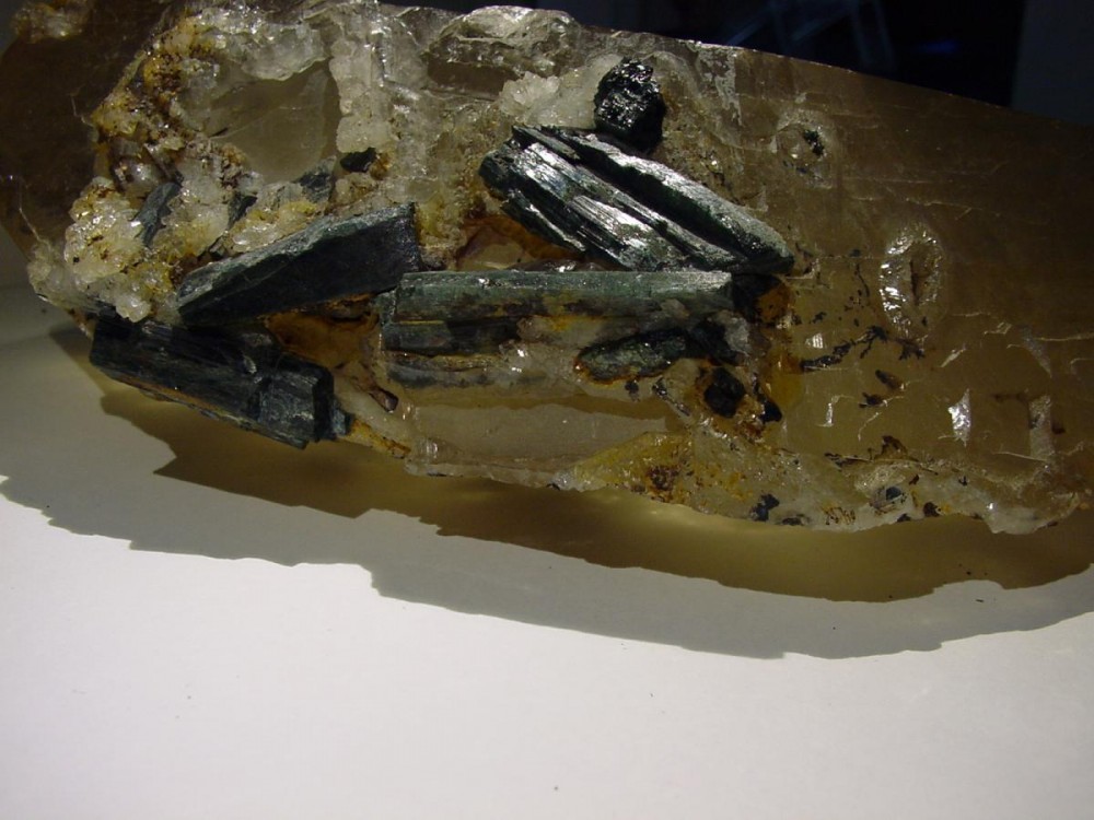 lors d'une brocante je vois un énorme cristal de Quartz légèrement fumé et assez plat mais cristallisé sur les deux faces, des inclusions de Baryte et des cristaux de Schorl sur un côté,