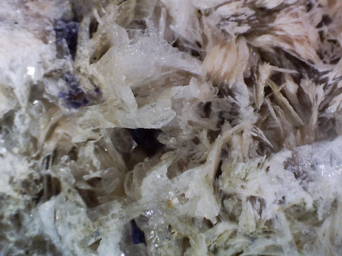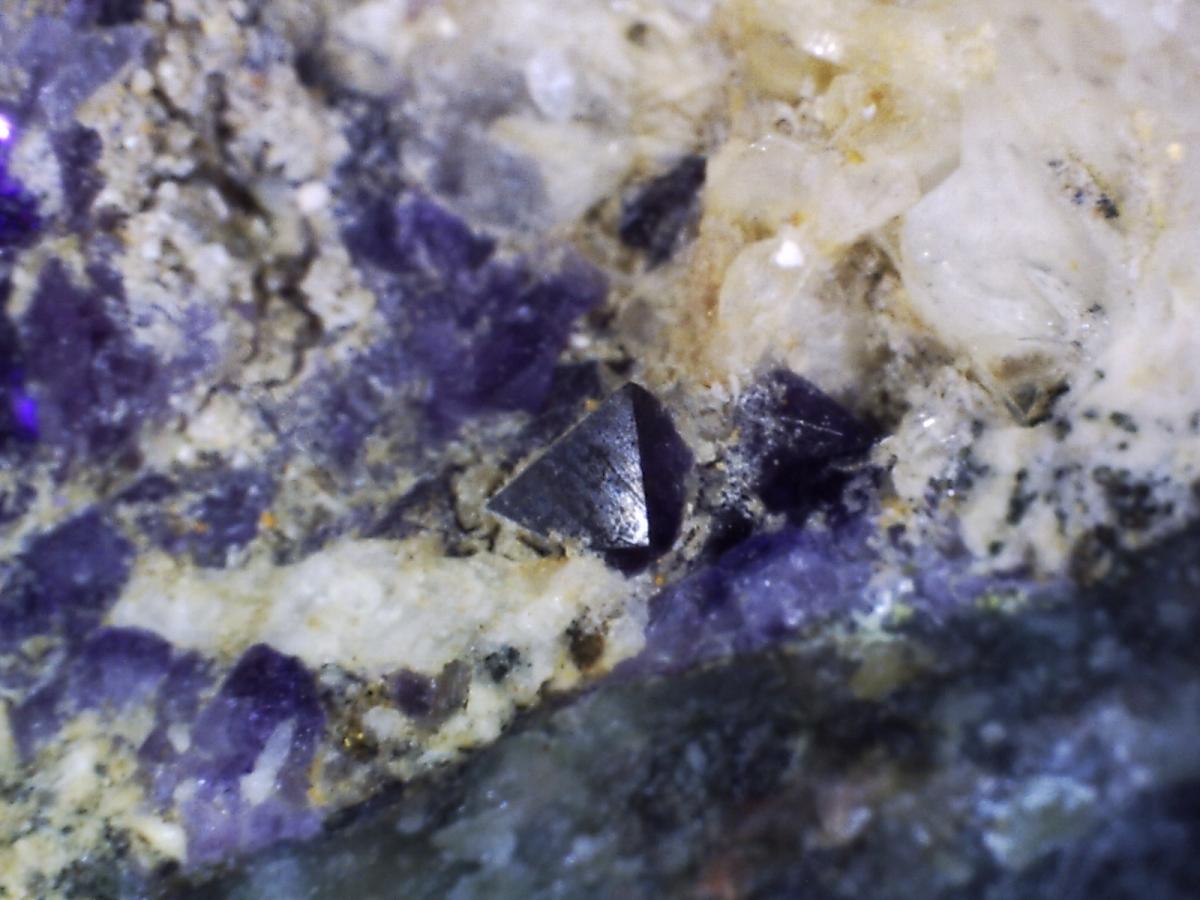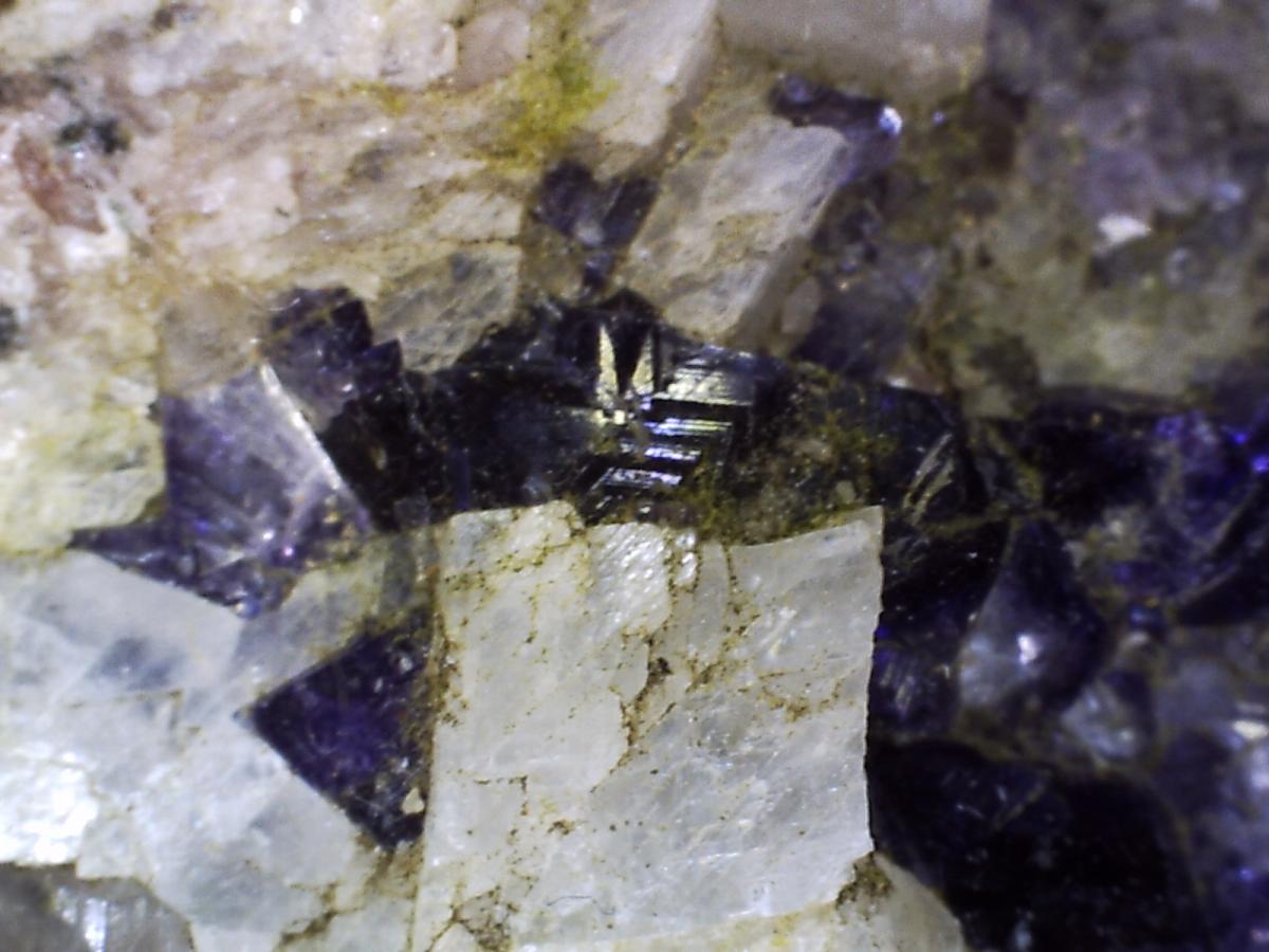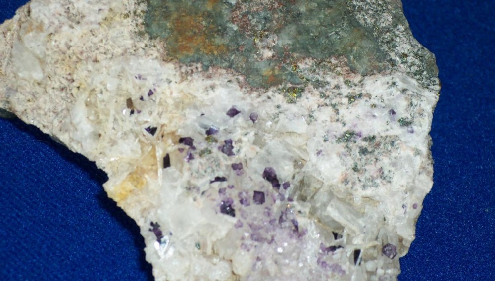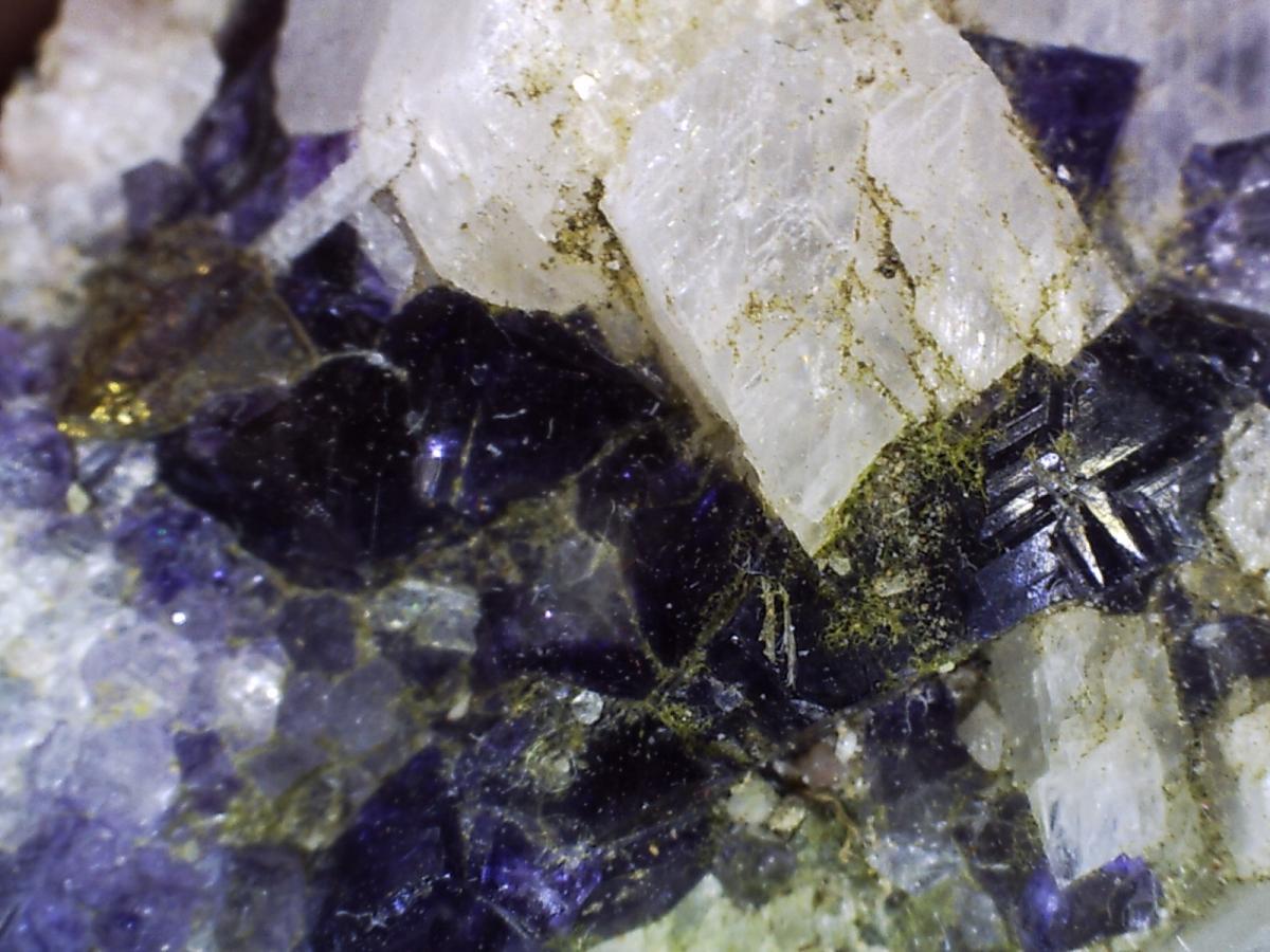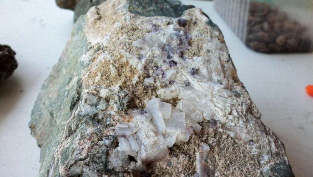 On y distingue déjà la fluo, et je pense de la chalcopyrite. Il y a également de la baryte le tout sur lit de calcite, que je vais m'empresser d'assaisonner au vinaigre blanc