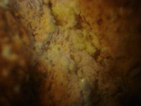 Tout d'abord, du super macro. Le fameux soufre du Sancy. J'ai trouvé cette pièce moi-même, il y a une dizaine d'années. Le soufre n'est pas rare au pied du Sancy (à gauche, dans le lit de la rivière derrière la petite maison). Il est accompagné d'une roche blanche, qui est de l'alunite essentiellement, ce qui a valu au lieu le nom de "ravin de la craie". Bien sur, il ne s'agit pas de craie !!!