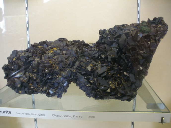 je ne crois pas que cet "échantillon" ait déjà été posté: azurite de Chessy entre 30 et 40 cm, je ne sais pas, mais c'est à tomber par terre :surpris: , visible au Museum de Londres: