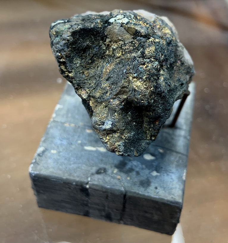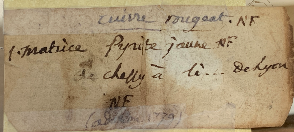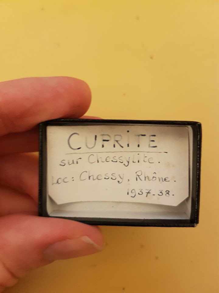 Il est très rare de 'trouver' un spécimen daté de 1779, qui plus est en minéralogie de la France, avec une minéralisation plutôt inconnue pour un gîte classique. Il pourra servir pour un livre sur 'Chessy', en gestation. Ce spécimen n'a de valeur que culturelle et historique. Pour ce qui est de sa valeur monétaire, les Institutions qui possèdent des Oldies ne les laissent pas partir pour une poignée de cacahuètes.