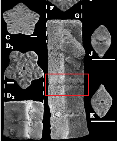 Il est aussi parfois dur de juger à partir d'un dessin ou d'une photo peu précise je le reconnais, une photo plus récente de Chariocrinus aff. wuertembergicus (Bathonien) in Underwood et al. 2009. La lecture du spécimen et de la partie que souligne PYB semble à mon avis perturbée par l'état d'usure du fossile.