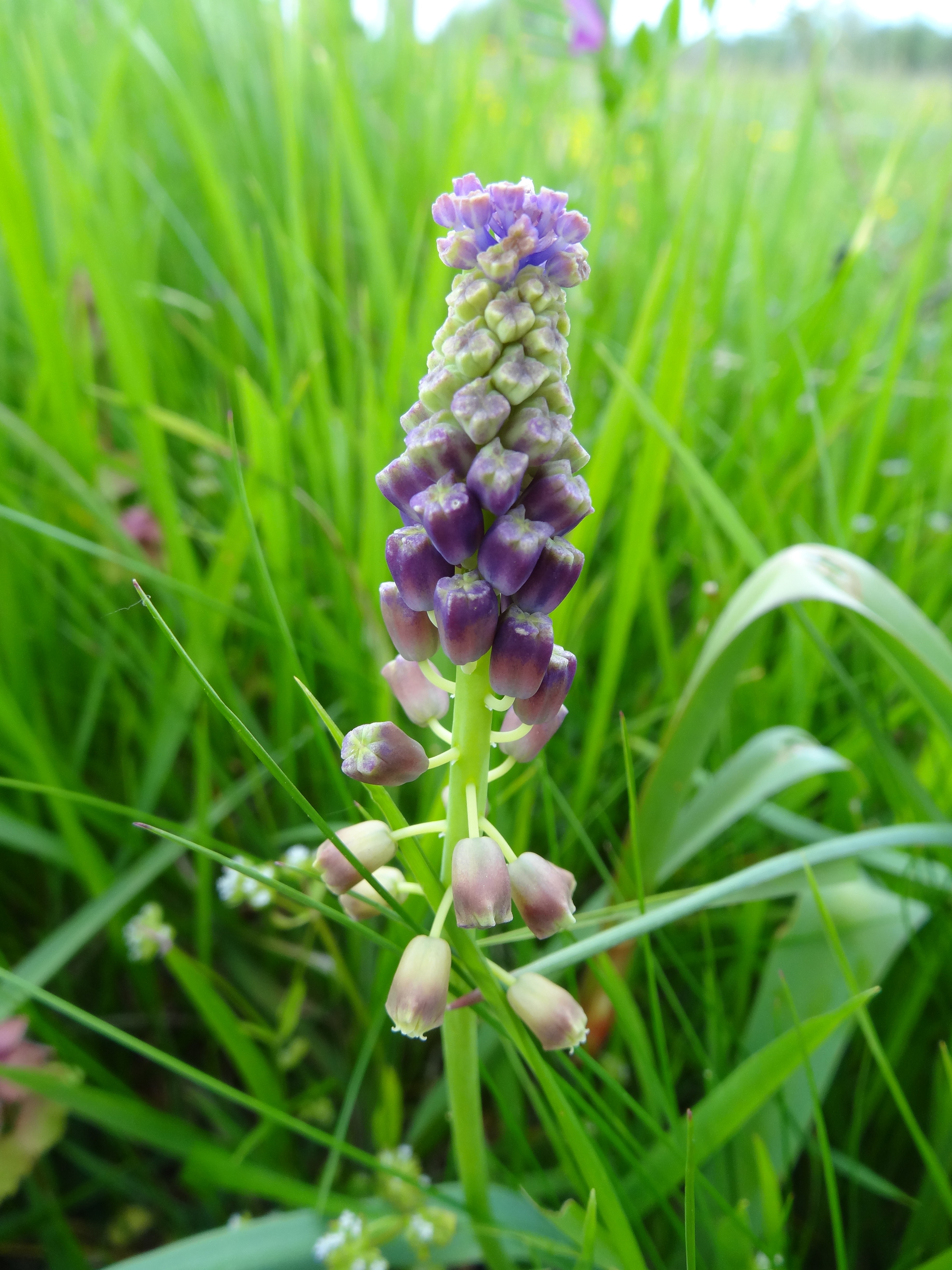 On dirait du muscari à toupet mais pas sûr à 100%.... Une indication sur sa taille (hauteur) pourrait aider. Il y a aussi des cultivars d'ornement qui peuvent "s'échapper" et on peut donc les trouver là où il ne devrait pas y en avoir.