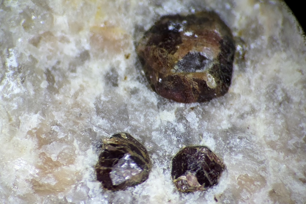 Les grenats se présentent sous la forme de tétragonotrioctaèdres représentatifs des grenats de granites/pegmatites, pour des dimensions jusqu’à 3 mm (dans le bloc que j’ai trouvé) (fig.1)