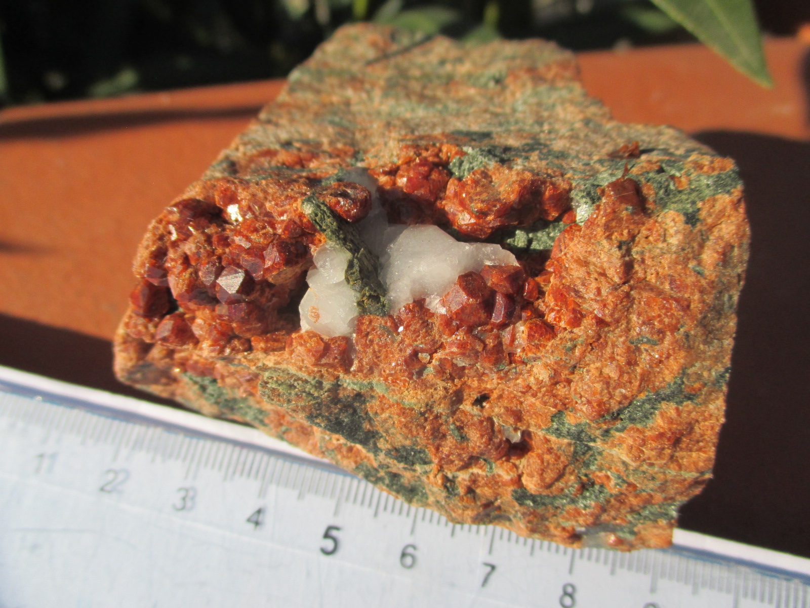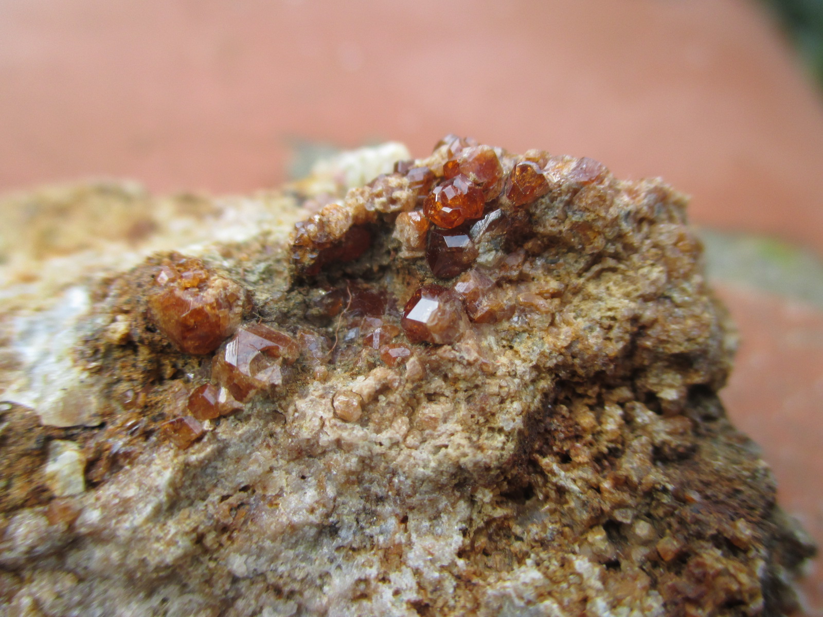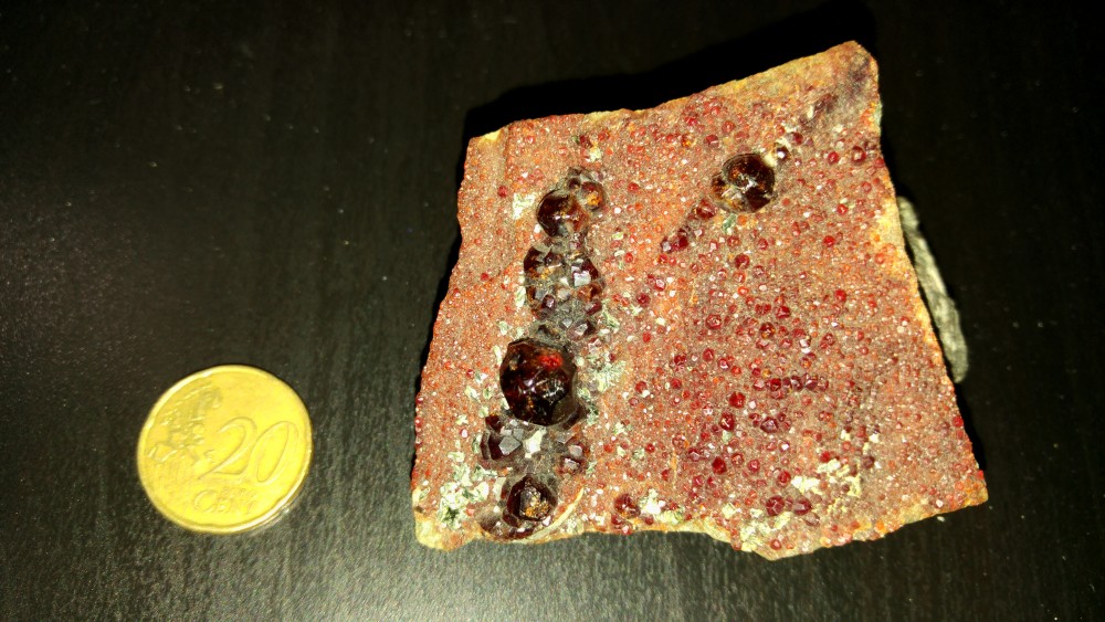 Pour la première , je demande l'aide des spécialistes. J'ai cet échantillon depuis très longtemps. La gangue est grenue et constituée de grains d'un minéral noir et de grains blancs qui semblent être du quartz, mais je peux me tromper. Le gros cristal d'almandin (je crois) fait 2 cm. Qu'est-ce que c'est, d'où ça vient ?