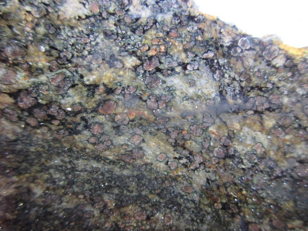Et les grenats, tout petits mais jolis ! Il y a des niveaux de grenatite dans ce gabbro, qui surprennent par leur densité !