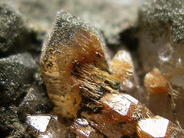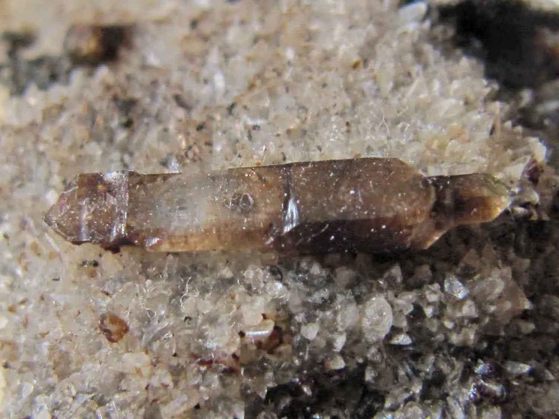 l'epidote en inclusion dans les quartz fumés, nous parait le plus posible, car ce secteur est riche en épidote dans et hors des quartz fumés, par contre nous avons aussi constaté dans certains quartz des empreintes négatives, l'épidote aurait disparue. fautes d'avoir eu le temps nous n'avons pas eu la chance de trouver de quartz assez grands pour faire des photos de qualité de ces empreintes négatives . Il faudra attendre l'année prochaine , peut-être . Pour les "chlorites "en inclusions dans les quartz maintenant que je peux enfin nettoyer et trier quelques mineraux, je m'apperçois qu'il y a de nombreuses teintes de chlorites différentes du presque blanc au noir en passant par les verts et les marrons. Je ne connais pas toutes les possibilités chimiques de la famille des "chlorites"pour savoir quel élément chimique favorise telle couleur .Souvenons nous du grand débat qu'il y a eu sur la chlorite brune du secteur de St.sorlin d'Arves .Pour Maronne je n'ai pas de certitude, j'ai trouvé que deux exemplaires valables à photographier, mais comme les inclusions ne sont pas cristallisées, il n'y a aucune certitude .Ce sont des minéralisations à faire analyser dans certains cas .La brookite est trés sympa dans le quartz.Je me suis aussi apperçu que les inclusions sont difficiles à photographier ( profondeur de champ)