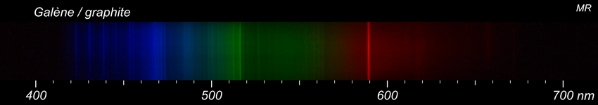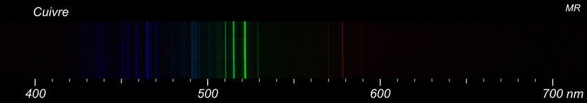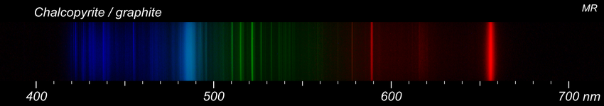 Le cuivre est assez facile à identifier dans le spectre de la chalcopyrite : un petit nombre de raies très lumineuses domine le reste.