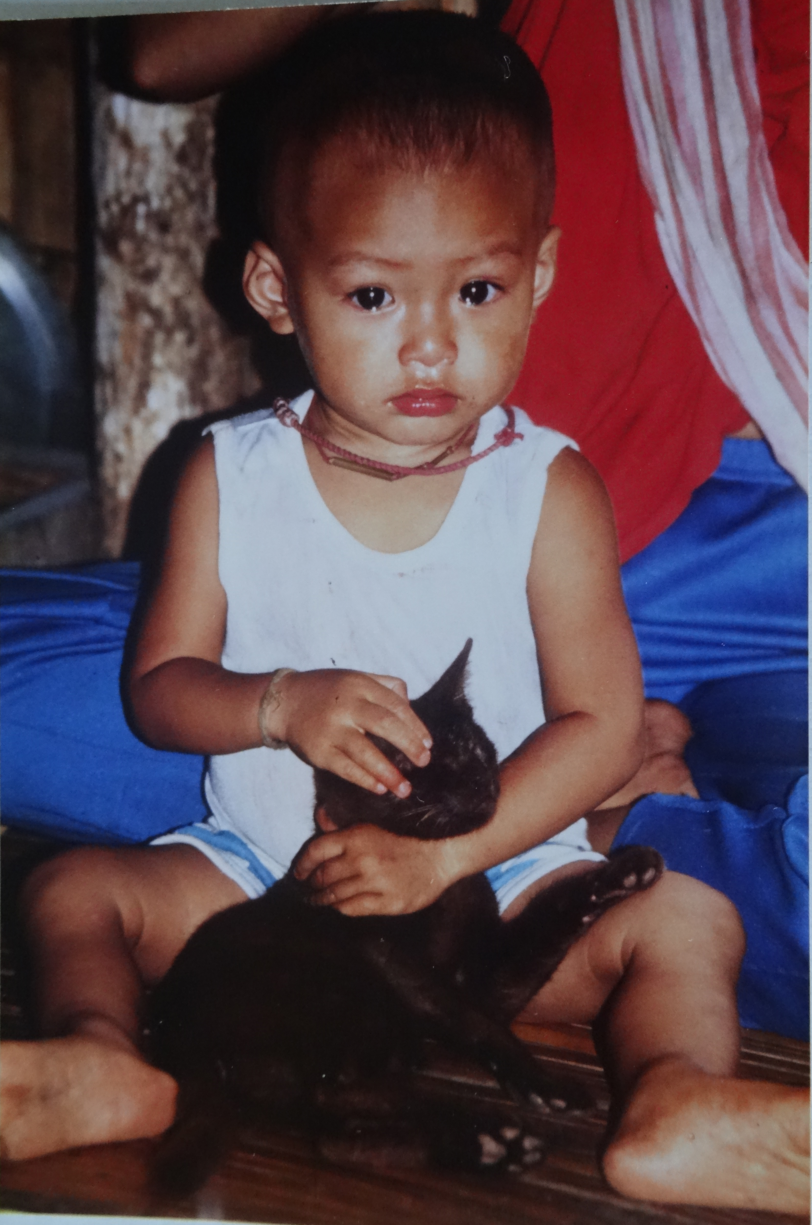 Un chat siamois (Thaïlandais) qui semble n'apprécier que très modérément le traitement amical que lui fait subir le garçonnet !   (1985)