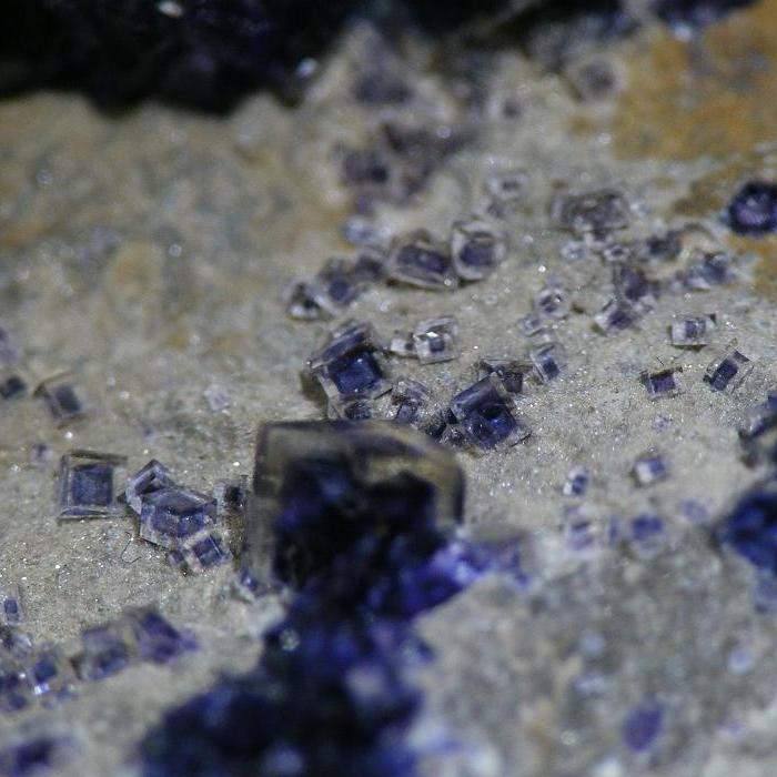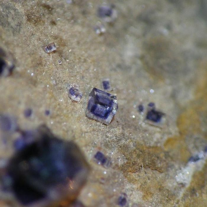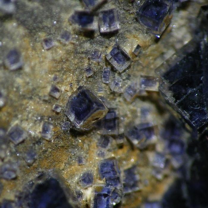 Sur le site, elle a plutôt tendance à former des "amas" de cristaux cubiques mâclés les uns aux autres...de couleur marron clair à foncé, également légèrement violette. Pas vu non plus en cubes "libres"....