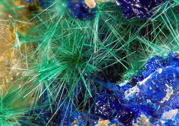 Cristaux aciculaires de brochantite associés à de la linarite. Ca vient de Copiapo.