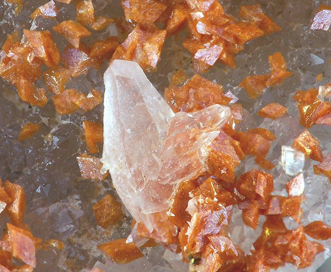 Calcite associée à des rhomboèdres de ferro-dolomie. Taille du scalénoèdre : 1,2mm
