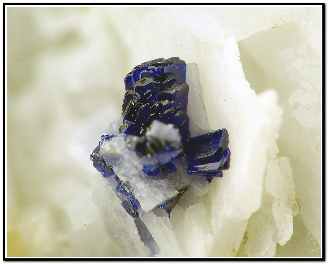 Après une séance de trimmage de ce week-end, sphérules d'azurite dans une géode de quartz.