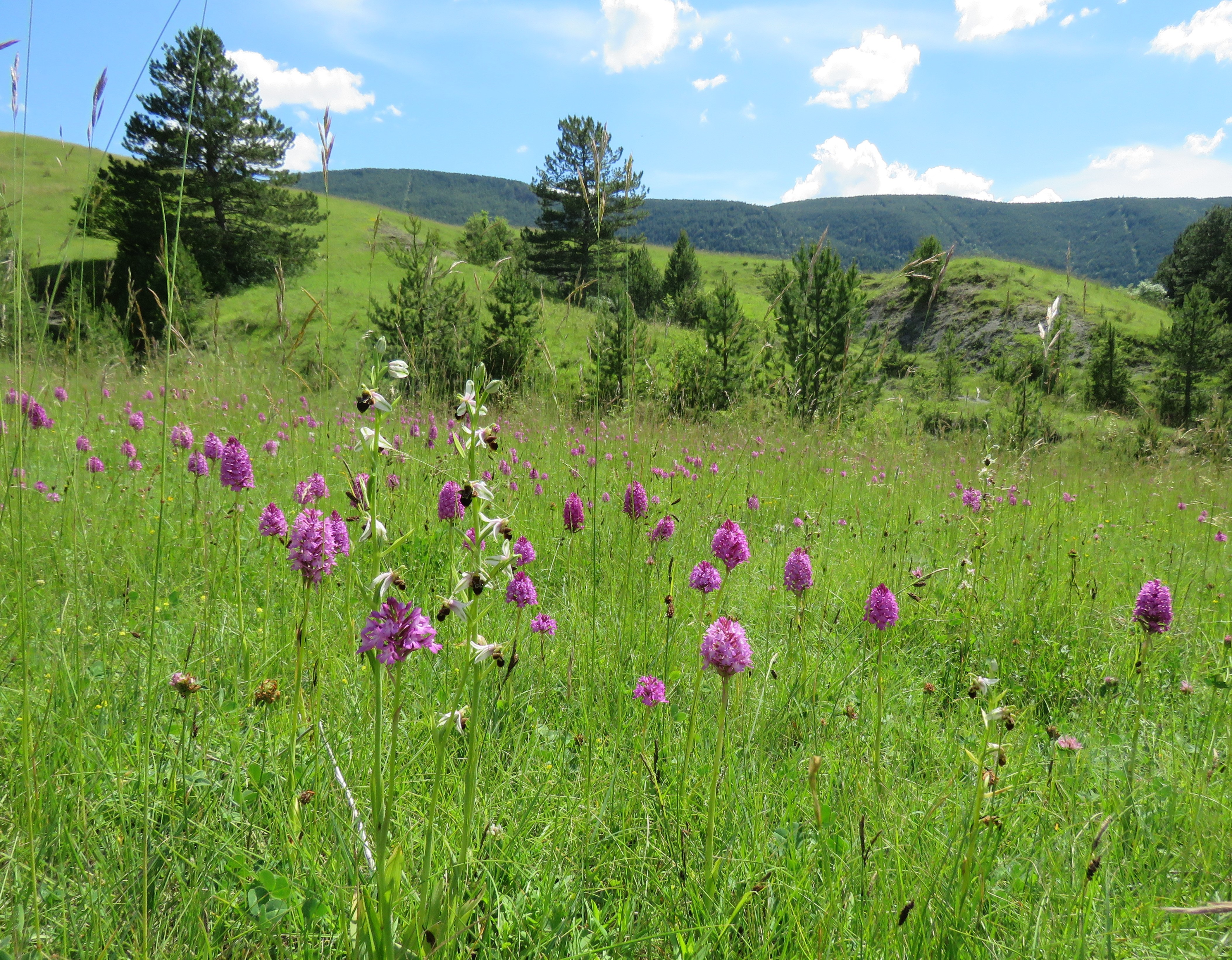vers une prairie assez spectaculaire avec ses centaines de hampes d'orchis pyramidal, parmi lesquelles se sont invitées plusieurs dizaines d'ophrys abeille.