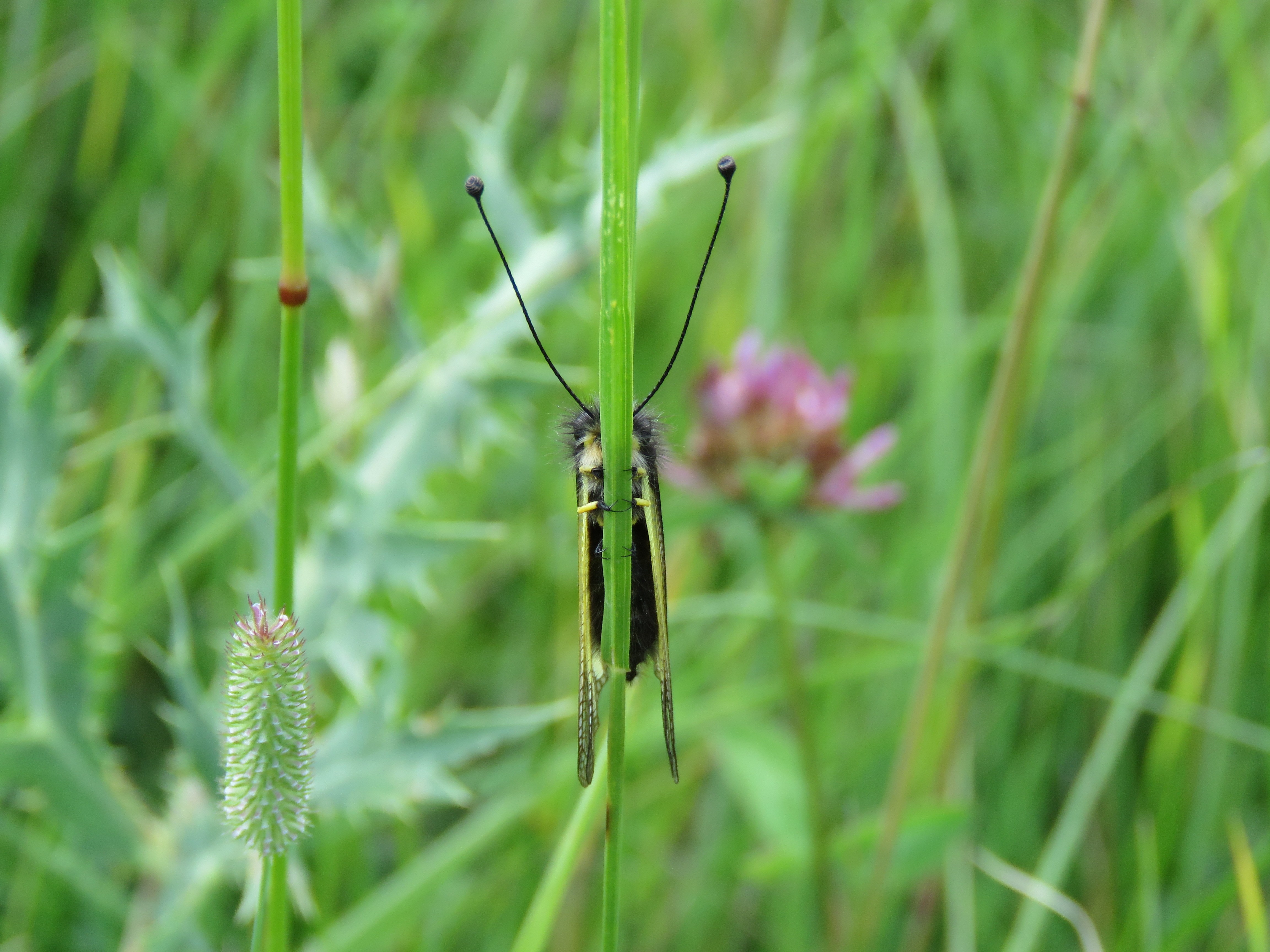 Au moment de rentrer, une rencontre avec un superbe ascalaphe soufré, très tranquille sur une herbe, sans doute un peu abruti par la chaleur. Mais encore assez vif  pour se déplacer systématiquement autour de sa tige d'herbe de façon à l'interposer exactement entre lui et moi. Je ne l'ai embêté que le temps d'arriver à le photographier de profil...  il a fallu ruser pour ça !