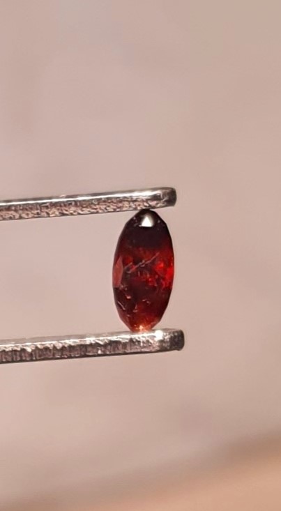 un autre zircon d'un beau rouge , diametre 5mm , il est rare que ces zircon conservent leurs couleur rouge la grande majorité deviennent brun apres exposition a la lumiere.
