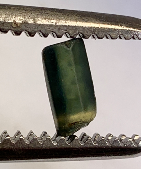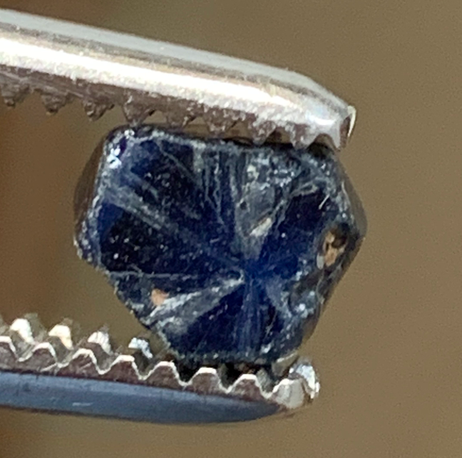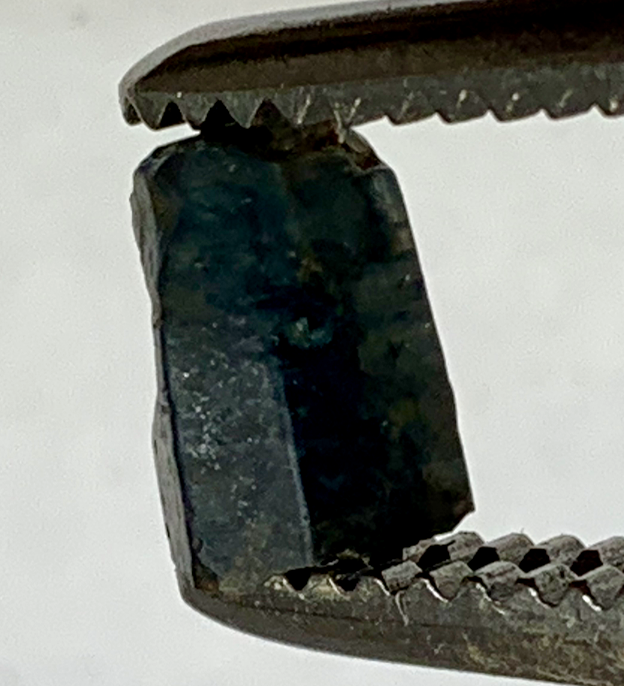 Corindon saphir , prisme hexagonal noir à nuances de bleu, un coté est 'fondu', l'autre est astérié (le coté le plus bleu)  [ca10mm]