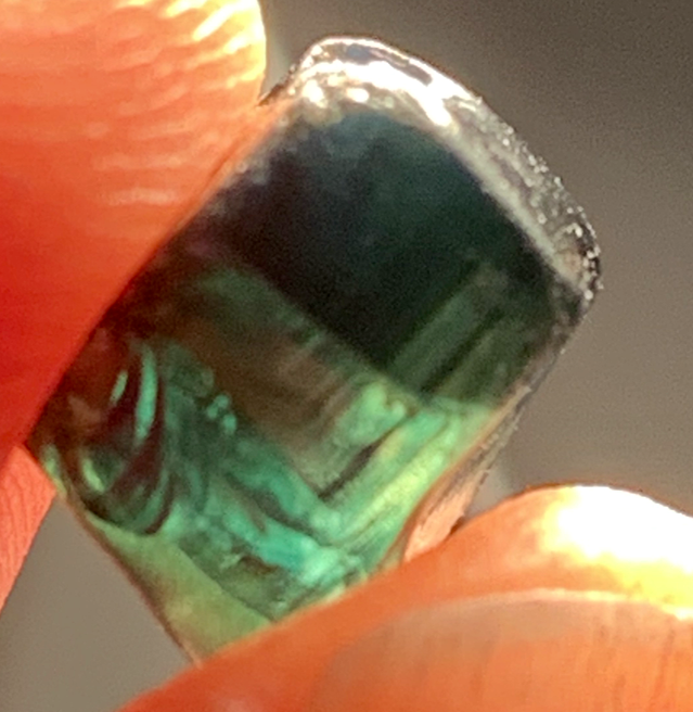 En le photographiant je me suis aperçu que le cristal montre un incroyable dichroïsme bleu/vert jaune (le vert jaune réel est ici altéré par l'Iphone)