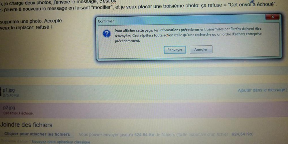 Puis j'ouvre à nouveau le message en faisant "modifier", et je veux placer une troisième photo: ça refuse = "Cet envoi a échoué".