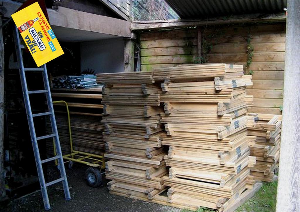 tout n'est pas sur la photo, il y a quand même 43 plateaux de 2 m, 7 tables de 2,5 m (pour nous et les micros) et 163 tréteaux !!