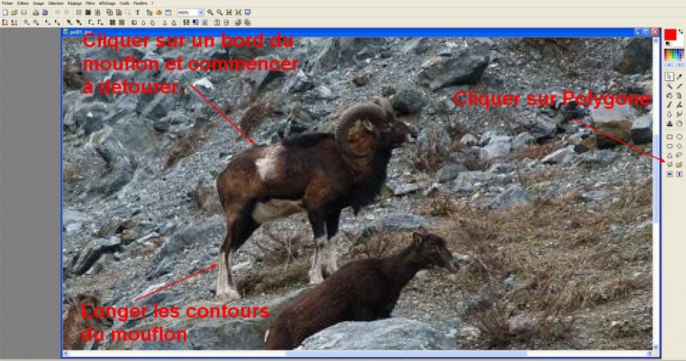 On va découper le mouflon mâle au centre. Une fois la photo sur Photofiltre, cliquer sur Polygone. Vous devez maintenant détourer manuellement le mouflon. Je vous conseille de zoomer. L'outil Polygone est un peu délicat à manier et il faut être patient. Placer le curseur sur un bord de l'animal et cliquer. C'est le point de départ. A partir de ce point, longer le bord de l'animal en cliquant à chaque changement de direction.