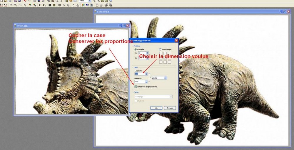 Cocher la case Conserver les proportions (pour ne pas déformer le dino en le réduisant) et changer la largeur (la hauteur sera automatiquement modifié car vous avez coché Conserver les proportions). Dans cet exemple, je passe la largeur de 1200 à 300.