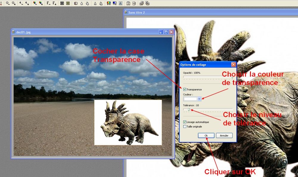 Maintenant que le dino a un fond bleu, on peut facilement le coller sur l'image à truquer avec la technique de transparence comme expliqué précédemment mais cette fois, on choisi bleu ciel comme couleur de transparence.