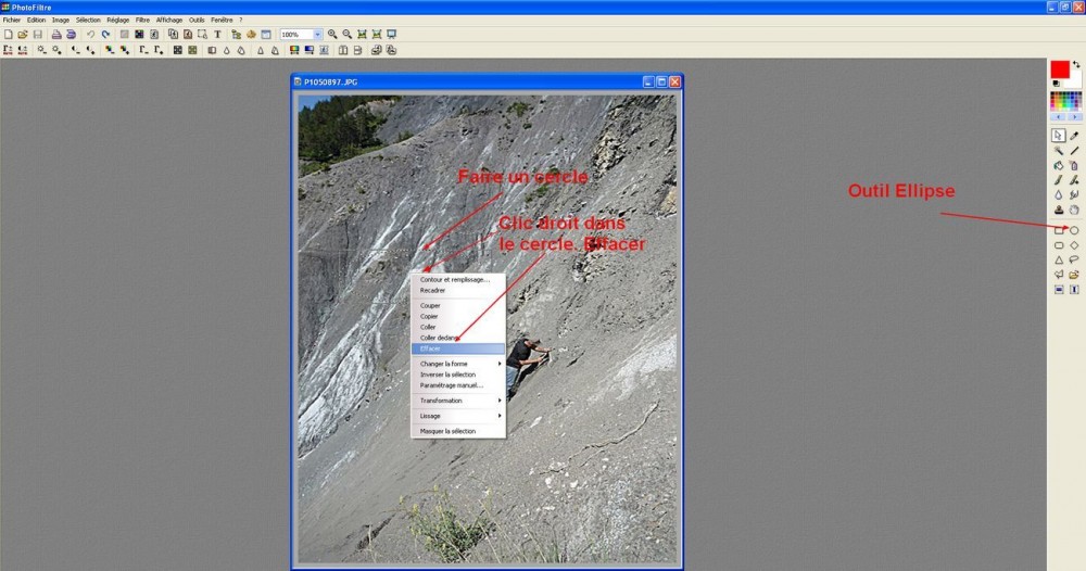 Vous ouvrez la photo à truquer sur Photofiltre. Vous cliquez sur l'outil Ellipse et vous faites un rond de la taille souhaitée et à l'emplacement voulu (ce cercle apparait en pointillé. Ce qu'il y a dans les pointillés, c'est votre Sélection en langage Photofitre). Puis vous faites un clic droit dans la sélection et vous cliquez sur Effacer (pour facilement régler les dimensions du cercle, faire un double-clic dans le cercle. Un rectangle apparait autour du cercle. Si vous placez le curseur sur le bord de ce rectangle, une double flèche apparait. Cliquez, maintenez enfoncé et réglez la hauteur et la largeur avec le curseur).