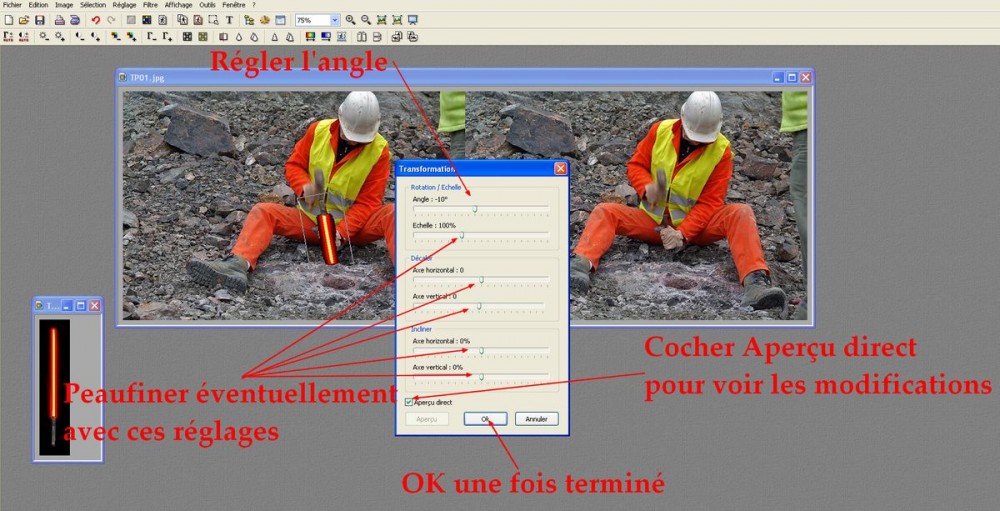 Placer le burin au bonnes proportions dans la main. Clic droit sur le burin et choisir Transformation - Paramétrée. Modifier l'angle. On peut aussi changer pleins d'autres choses, faites des essais (vous pouvez par exemple déplacer légèrement votre collage de gauche à droite et de bas en haut ou encore changer la taille du collage).