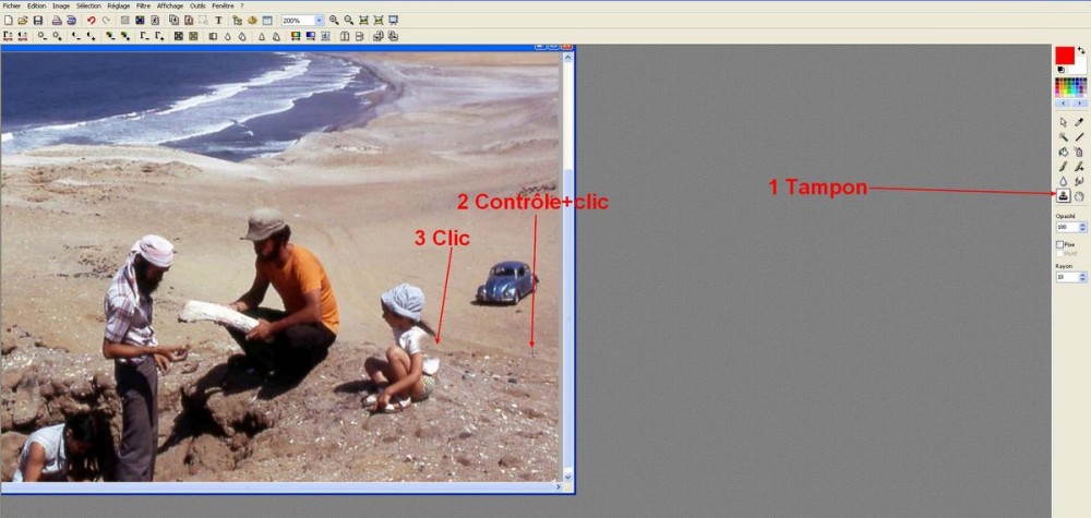 On va effacer l'enfant à droite avec l'outil Tampon parce que Géoforum, c'est vraiment trop dur pour les enfants. Cliquer sur Tampon puis choisir une zone à proximité de l'enfant. Appuyer sur Contrôle et cliquer. Relâcher contrôle, mettre le curseur sur le bord de l'enfant et cliquer. Effacer la plus grande partie possible avant d'être obligé de prendre un autre point de départ pour le tampon. Recommencer autant de fois que nécessaire (2 fois pour cet exemple).