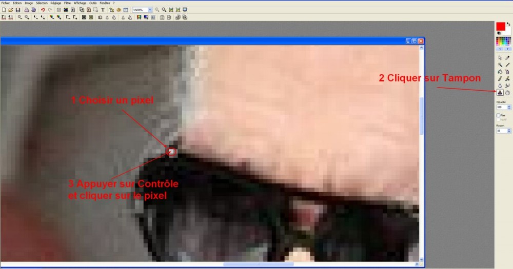 Zoomer au maximum dans la zone sélectionnée. Cliquer sur l'outil Tampon. Appuyer sur Contrôle, maintenir appuyé et cliquer sur le pixel sélectionné (ici je choisis le pixel le plus blanc, il sera facile de le retrouver sur le Karl avec banane)