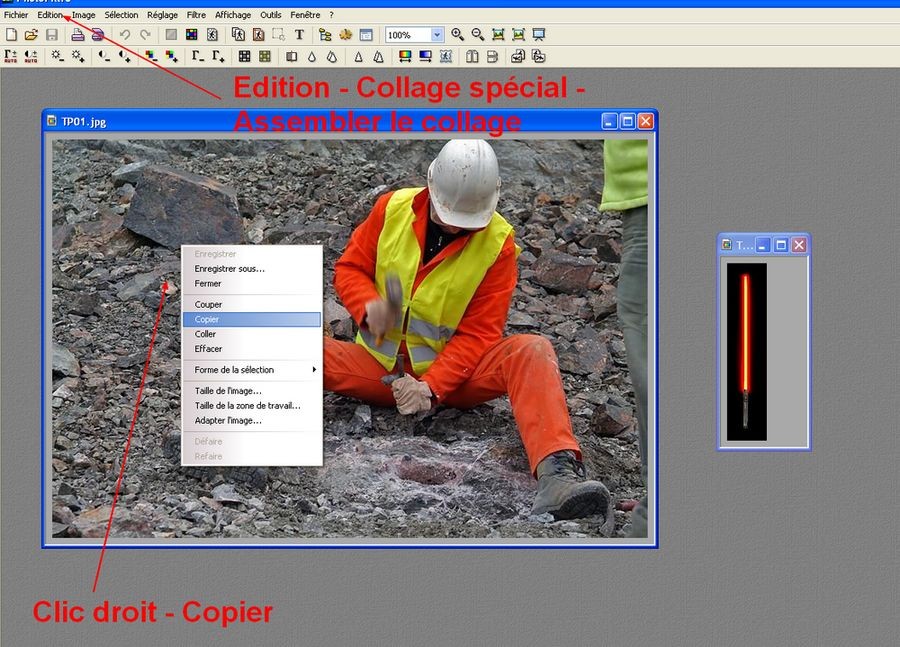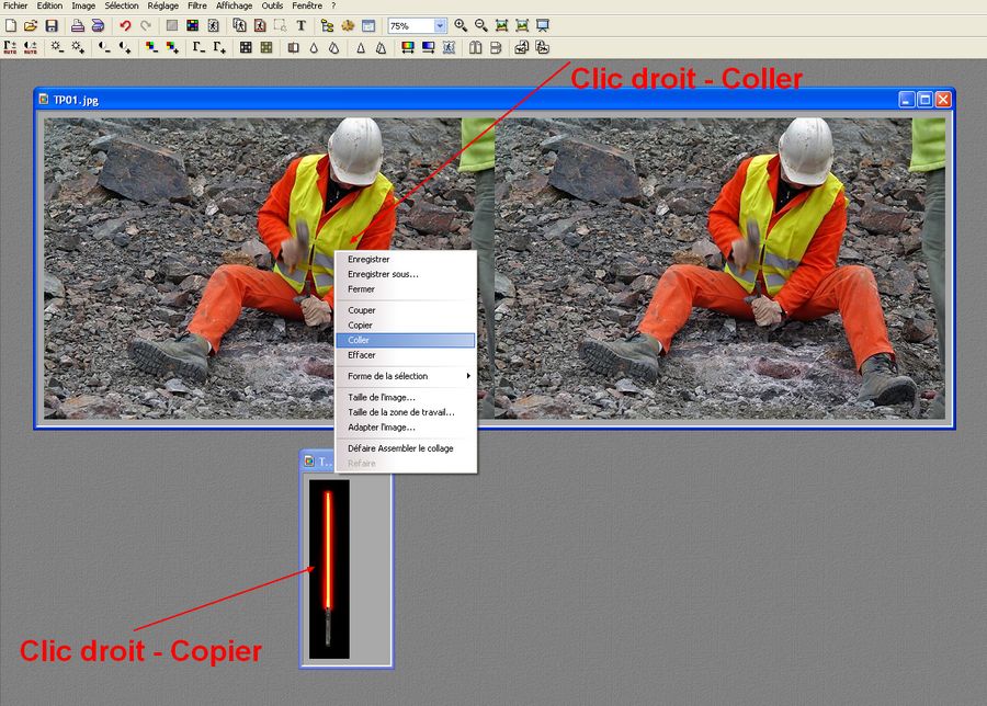 Clic droit - Copier sur la première image, Edition - Collage spécial - Assembler le collage (pour l'exemple, j'ai pris droite). Puis Clic droit - Copier sur le sabre et coller sur l'image 1.