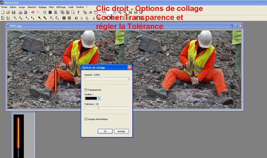 Clic droit - Options de collage sur le burin, Transparence sur le noir.