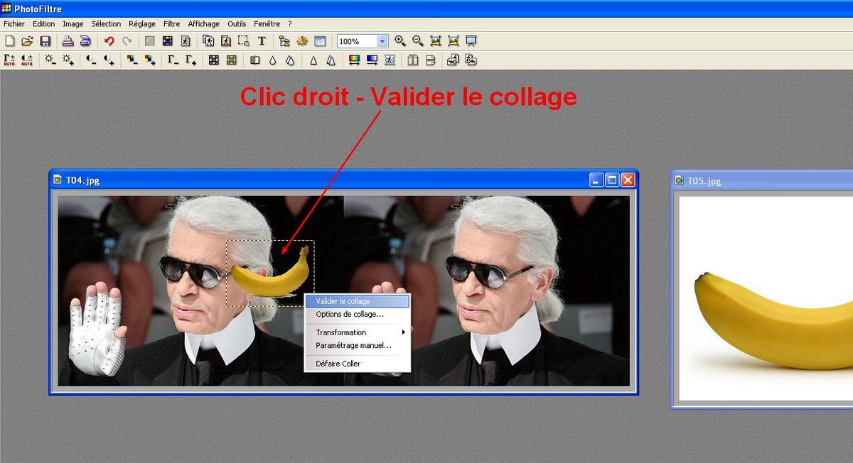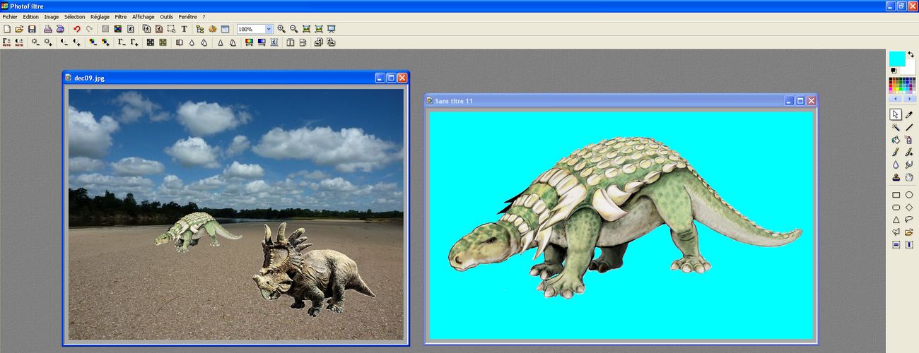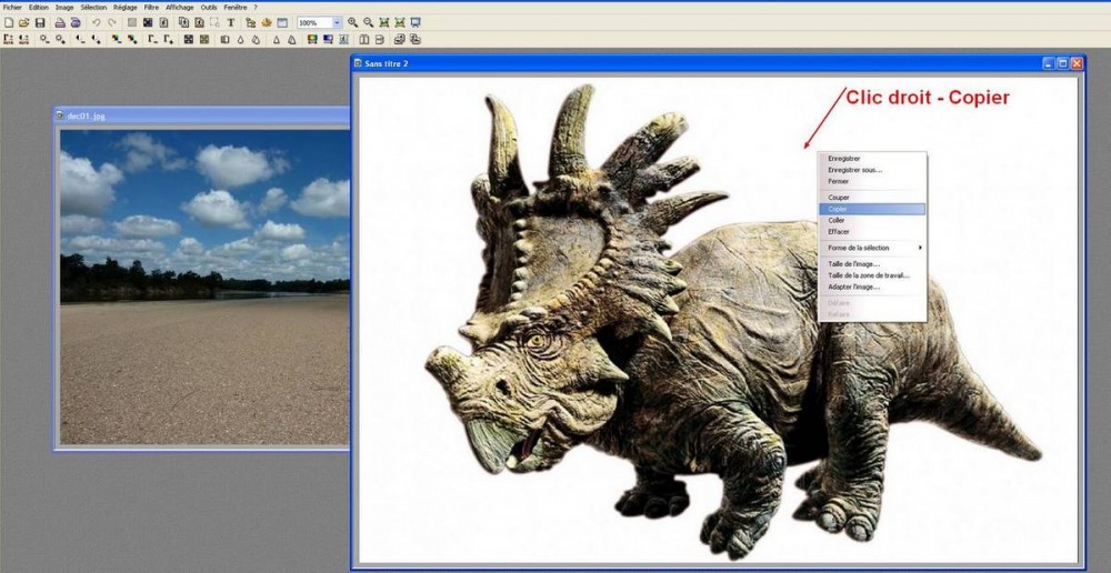 Ouvrir la photo à truquer et l'image à insérer (ici l'image du dino n°1) sur Photofiltre. Faire un Clic droit sur l'image à insérer puis Copier.