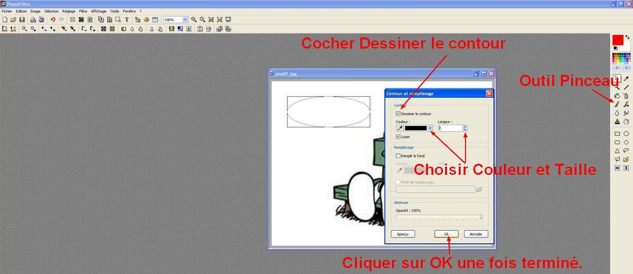Cocher dessiner le contour, choisir sa couleur et sa largeur, cliquer sur Aperçu pour voir si ça va et cliquer sur OK. Même principe pour le triangle qui va de la bulle au personnage qui parle (avec l'outil polygone) mais après avoir fait Effacer (pour effacer le petit morceau du cercle qui traverse le triangle).