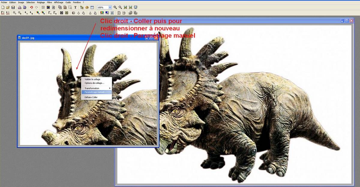 Faire un Clic droit dans l'image à truquer et faire coller. Dans cet exemple l'image de dino est beaucoup plus grande que l'image à truquer. Il faut la redimensionner. Faire Clic Droit - Paramétrage manuel.