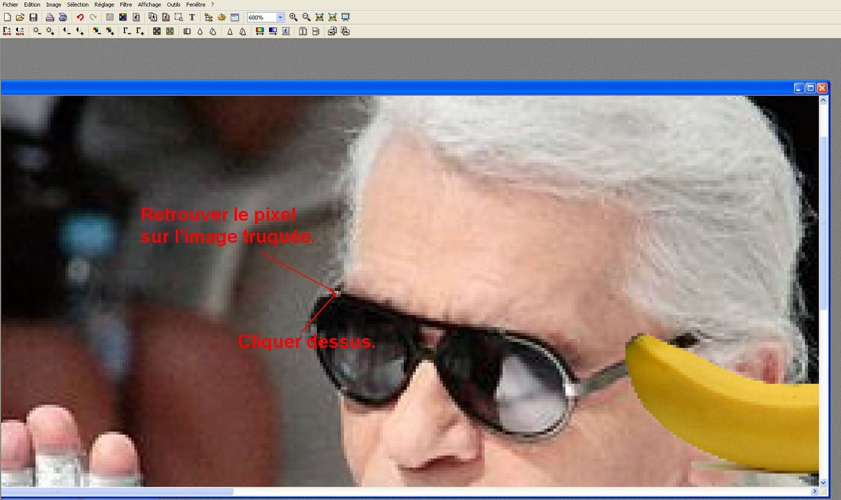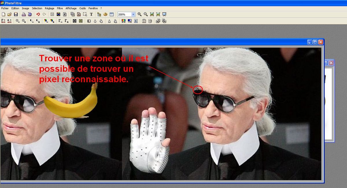 Zoomer un peu au niveau du Karl sans banane. Essayer de trouver un pixel reconnaissable. Dans l'exemple, il y a une zone intéressante au niveau des lunettes, un tout petit peu de blanc dans le noir de la monture des lunettes.