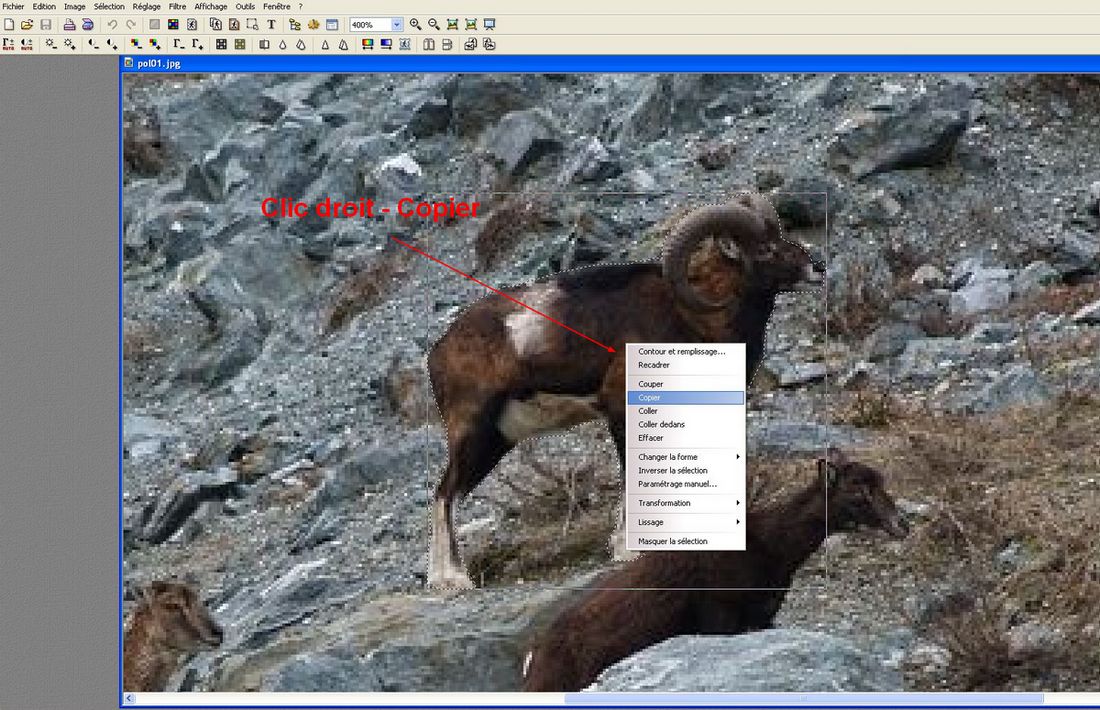 Faire un Clic droit dans la sélection et faire Copier. A partir de ce moment, vous pouvez coller votre mouflon sur n'importe quelle photo ouverte sur Photofiltre.